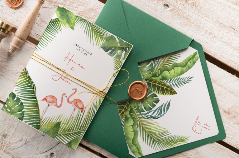 Zaproszenia ślubne z motywem flamingów, chodziły za mną od dawna! Nie chcialam aby wyglądały dziecinnie albo tandetnie, dlatego też postawiłam