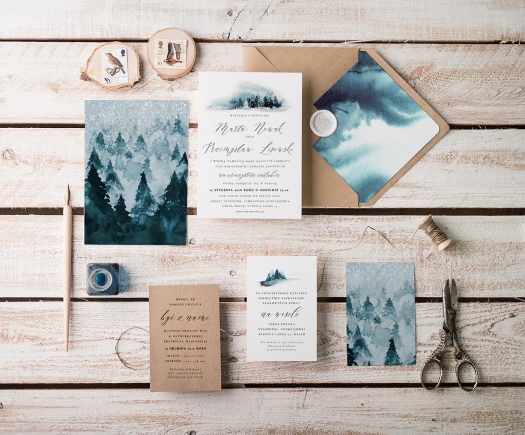 Zimowe zaproszenia ślubne nie muszą być tylko typowo ”świąteczne” Zaproszenia z motywem lasu, jakby oprószonego śniegiem wprowadzają w klimat a
