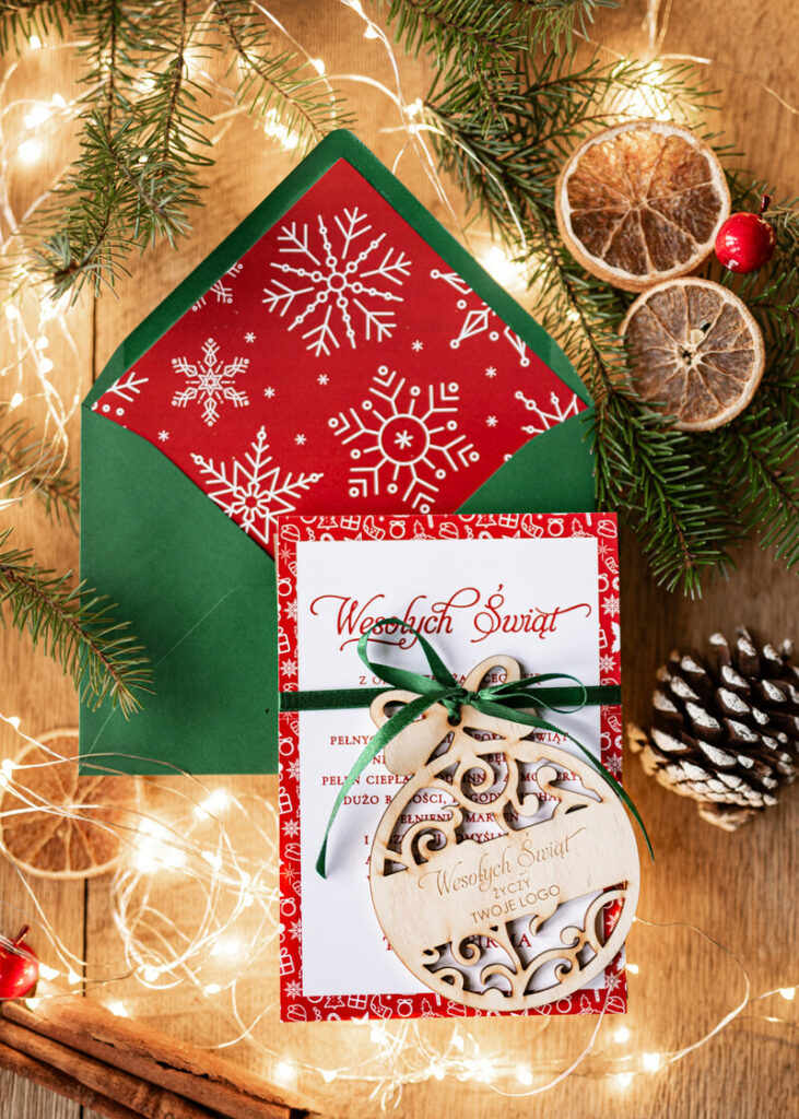 Kartki świąteczne dla firmy z logo i drewnianą bombką Święta Bożego Narodzenia to czas radości, miłości i życzliwości, a także