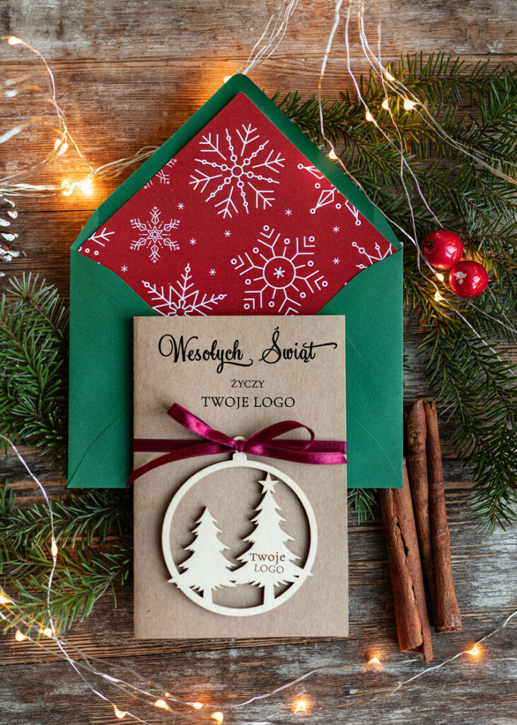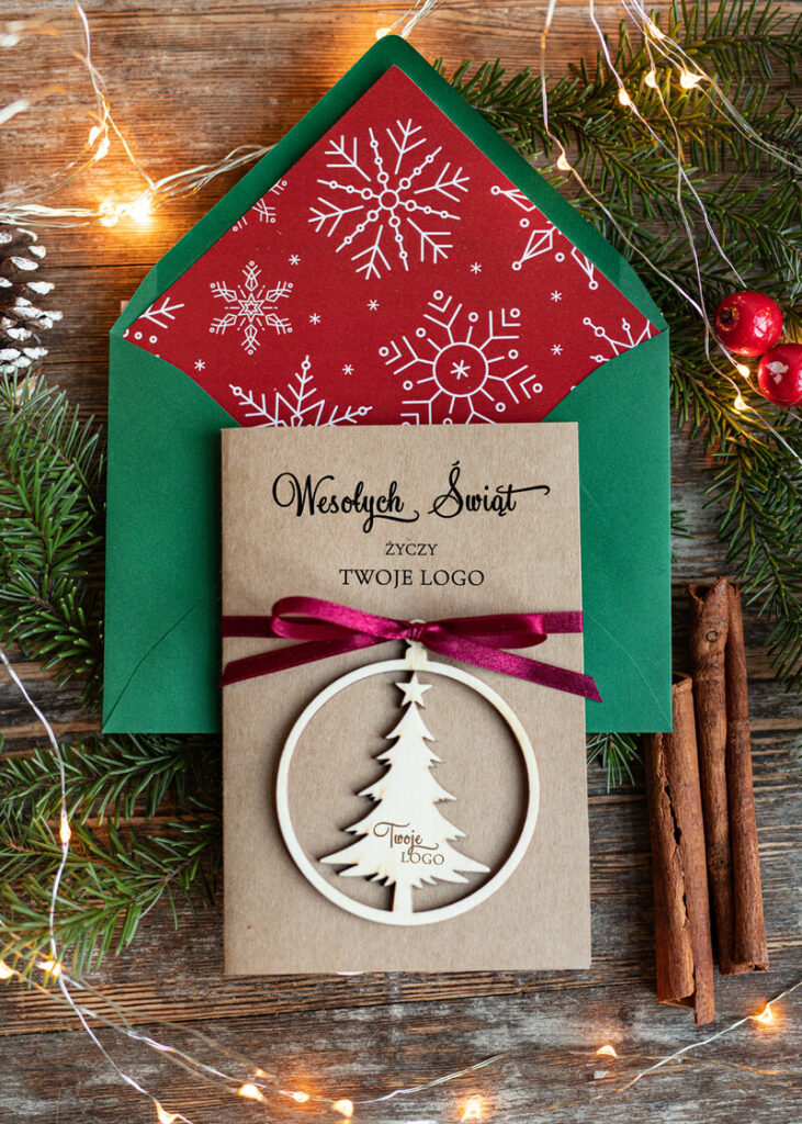 Kartki świąteczne dla firm: Drewniana bombka zawieszka na choinkę z logo firmy – świateczna kartka firmowa choinki