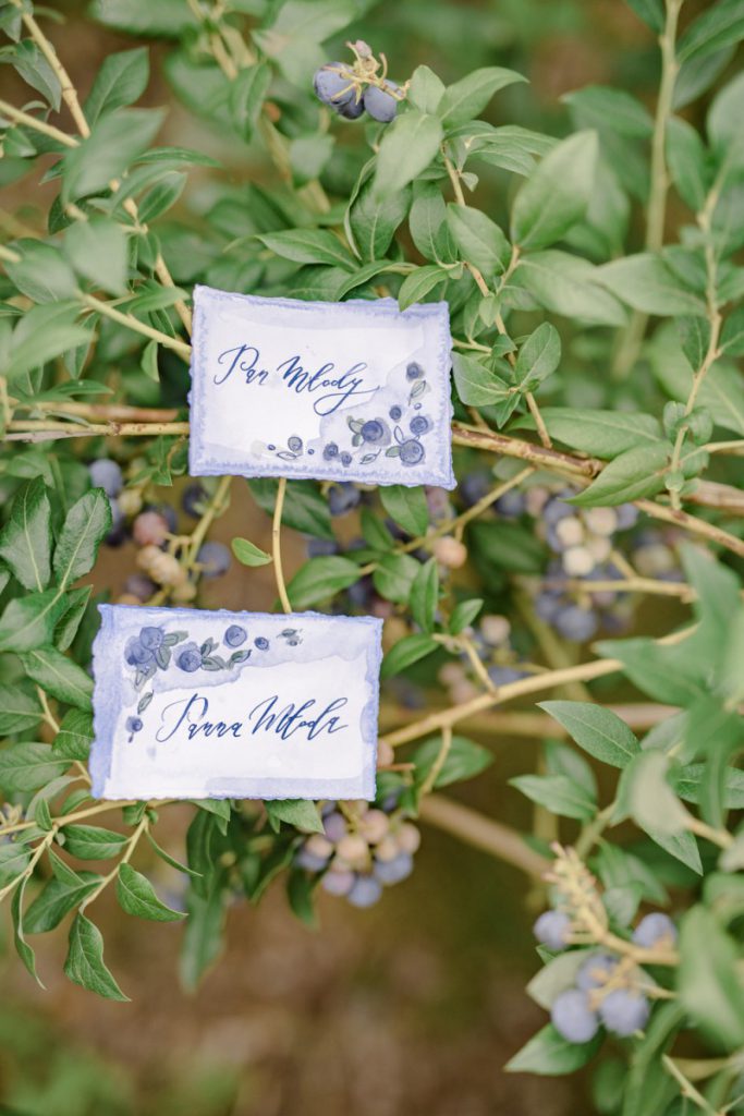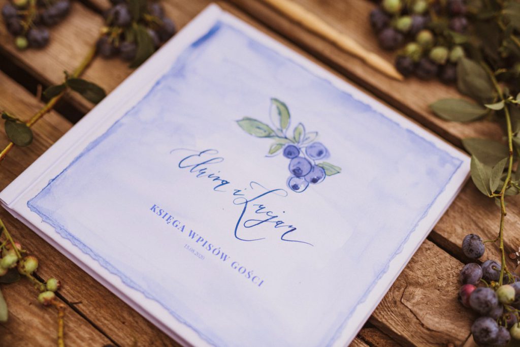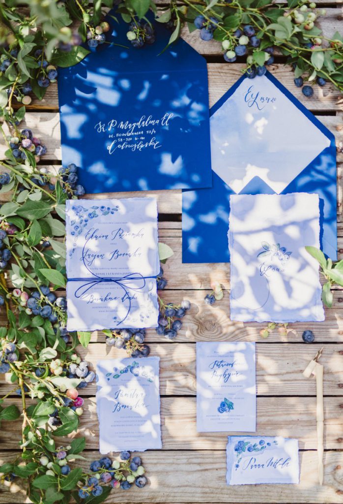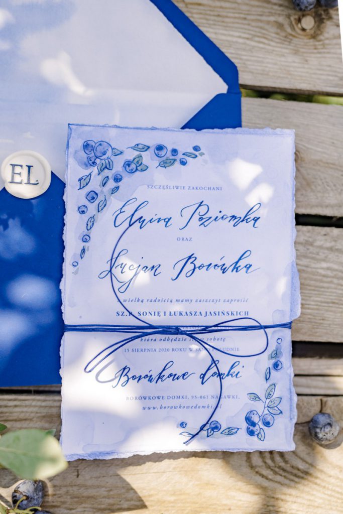 Zaproszenia na ślub z borówkami, wykonaliśmy malując je ręcznie oraz kaligrafując imiona młodych, taka forma zaproszeń jest bardzo nowoczesna i oryginalna.