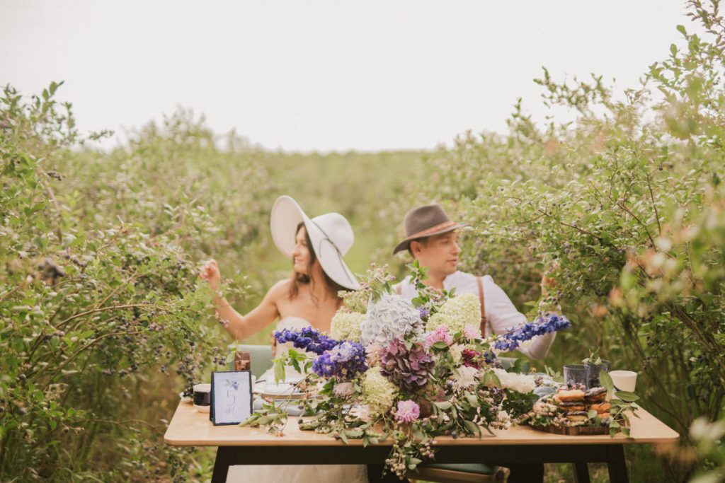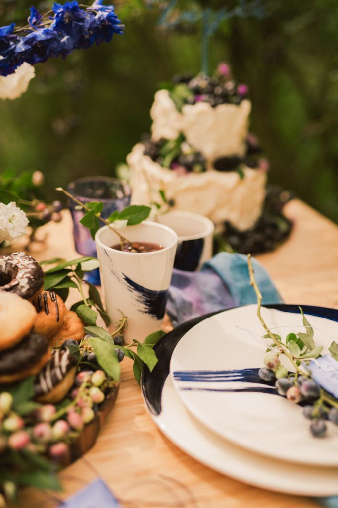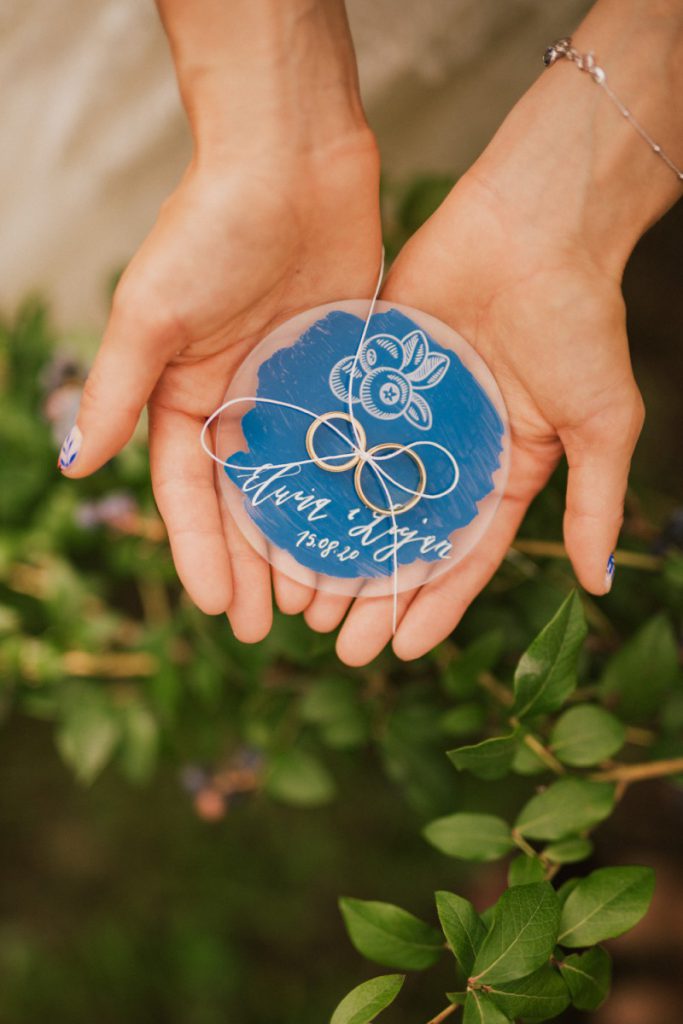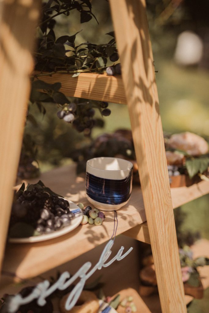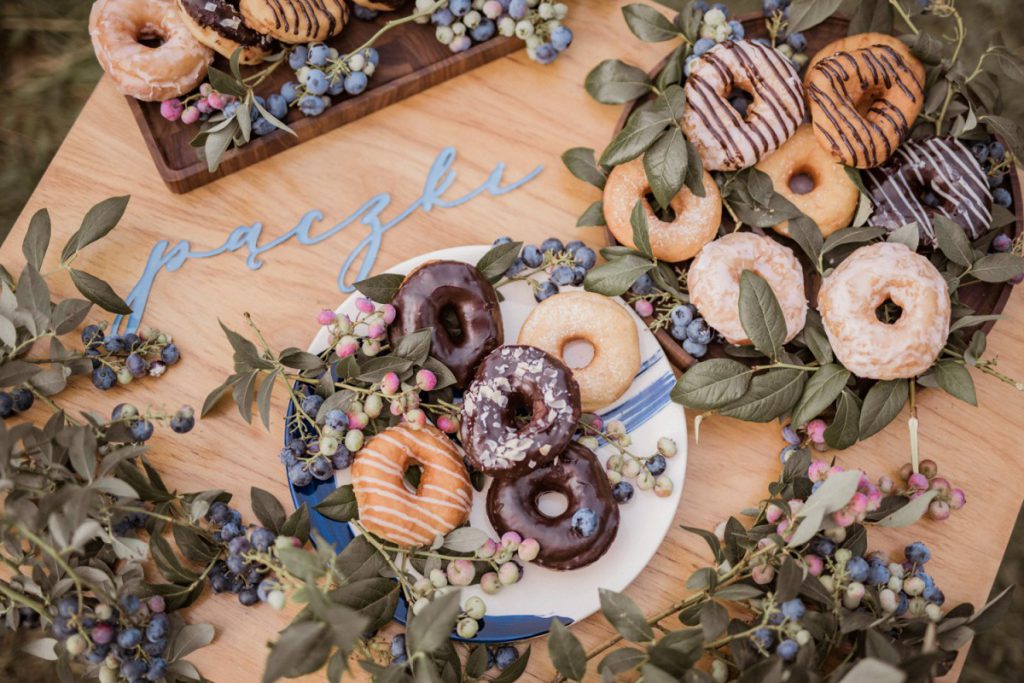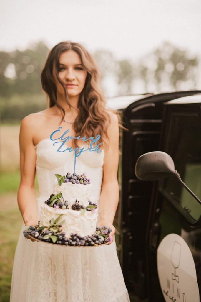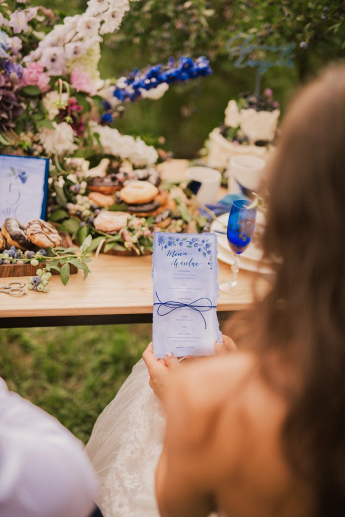 W naszej sesji, postawiliśmy oprócz tytułowych borówek na wszelkie odcienie niebieskiego, delikatne koronki (jak te w sukni Kamili) oraz drewniane elementy. Na uwagę zasługują dodatki na stole – przepiękna, ręcznie malowana zastawa od Mood Moments.