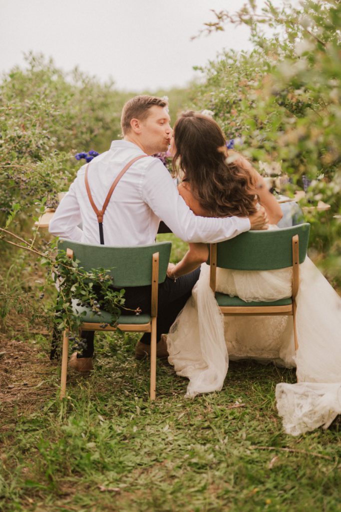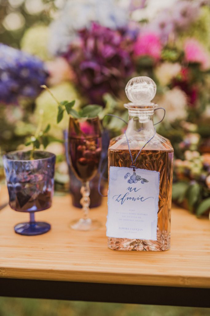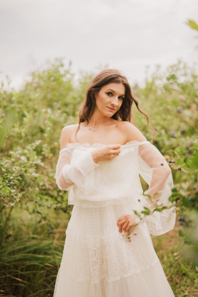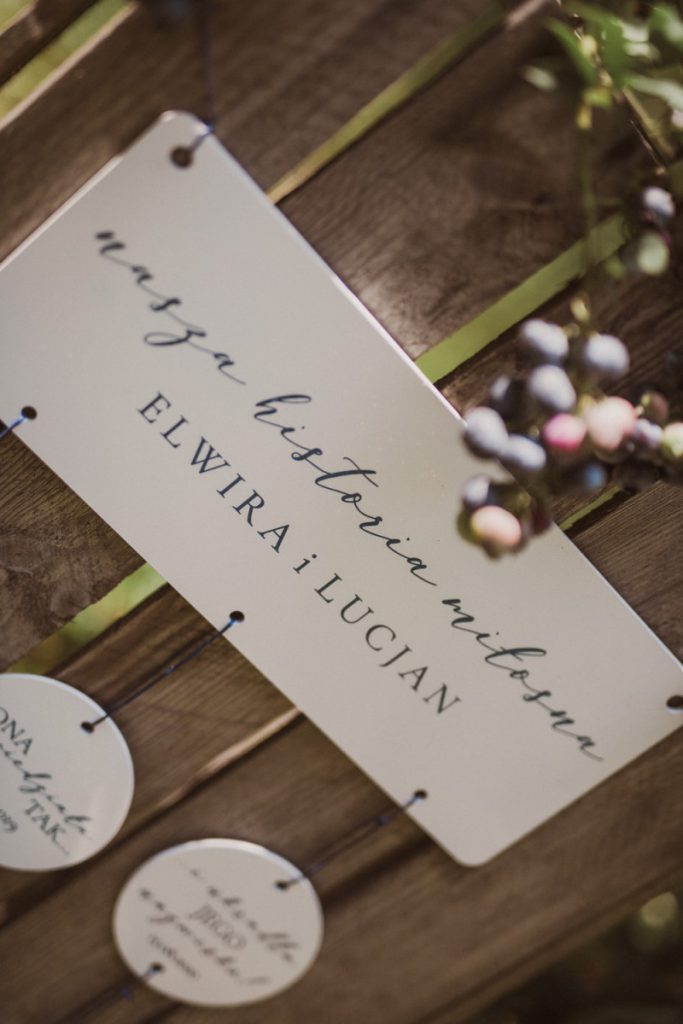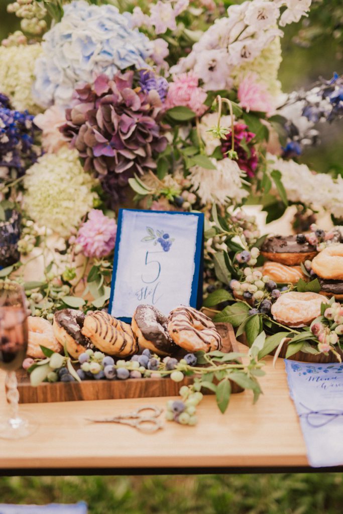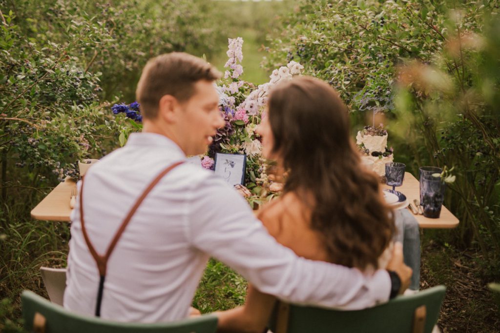 W naszej sesji, postawiliśmy oprócz tytułowych borówek na wszelkie odcienie niebieskiego, delikatne koronki (jak te w sukni Kamili) oraz drewniane elementy. Na uwagę zasługują dodatki na stole – przepiękna, ręcznie malowana zastawa od Mood Moments.