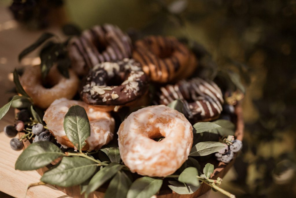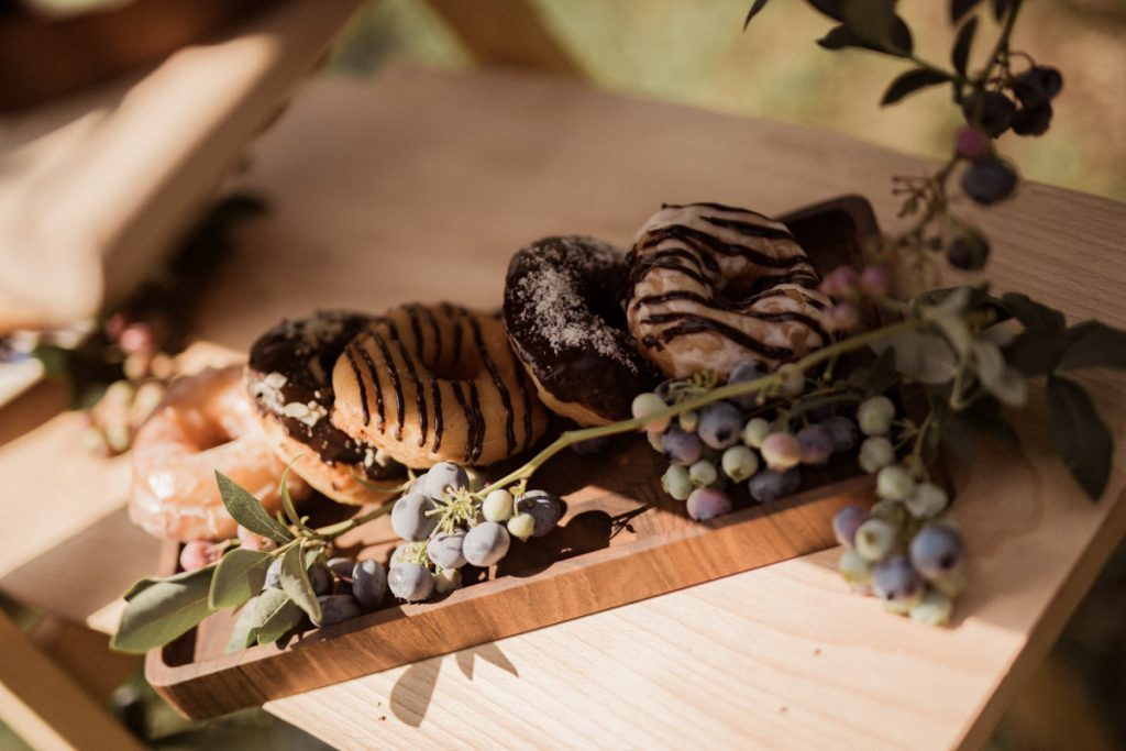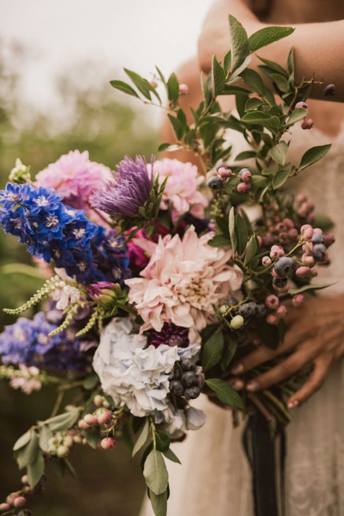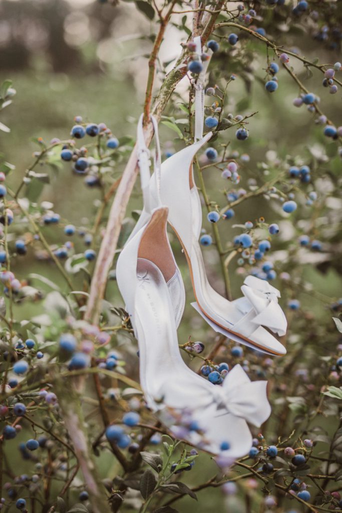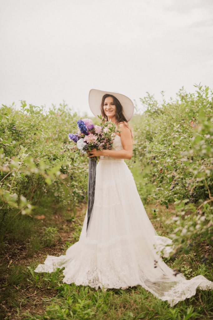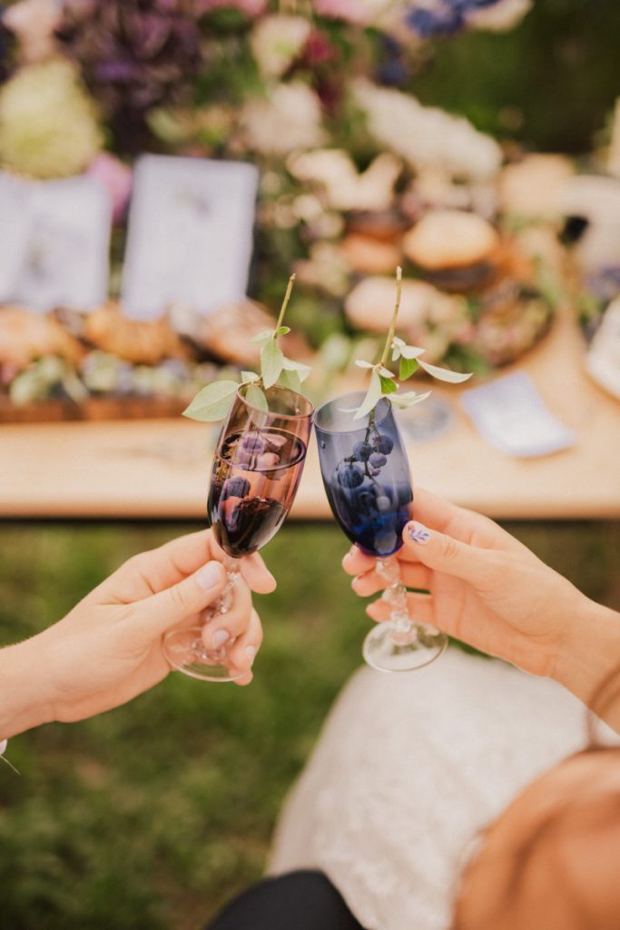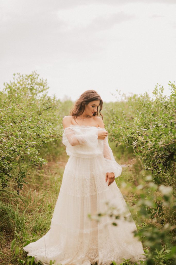 W naszej sesji, postawiliśmy oprócz tytułowych borówek na wszelkie odcienie niebieskiego, delikatne koronki (jak te w sukni Kamili) oraz drewniane elementy. Na uwagę zasługują dodatki na stole – przepiękna, ręcznie malowana zastawa od Mood Moments.