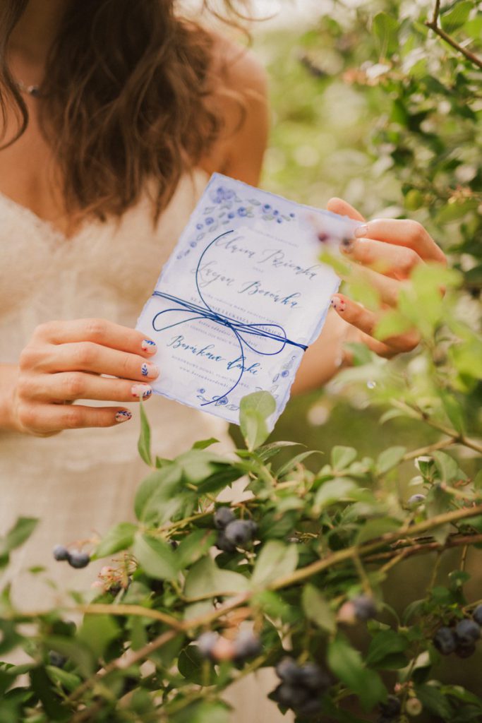 Motyw owoców, jest bardzo ciekawym pomysłem na wasz ślub – możecie wykorzystać sezonowe owoce w dekoracjach oraz na zaproszeniach ślubnych. Przygotowane dla was wyjątkowe zaproszenia ślubne z borówkami i nowoczesną kaligrafią na pewno spodobają się Waszym gościom. Wybranie na motyw wesela owoców, jest bardzo dobrym pomysłem – w letnim okresie owoce są stosunkowo tanie i łatwo dostępne.