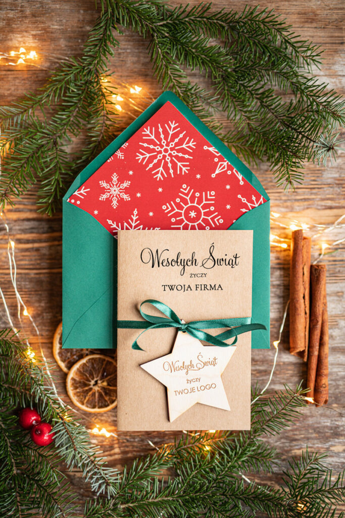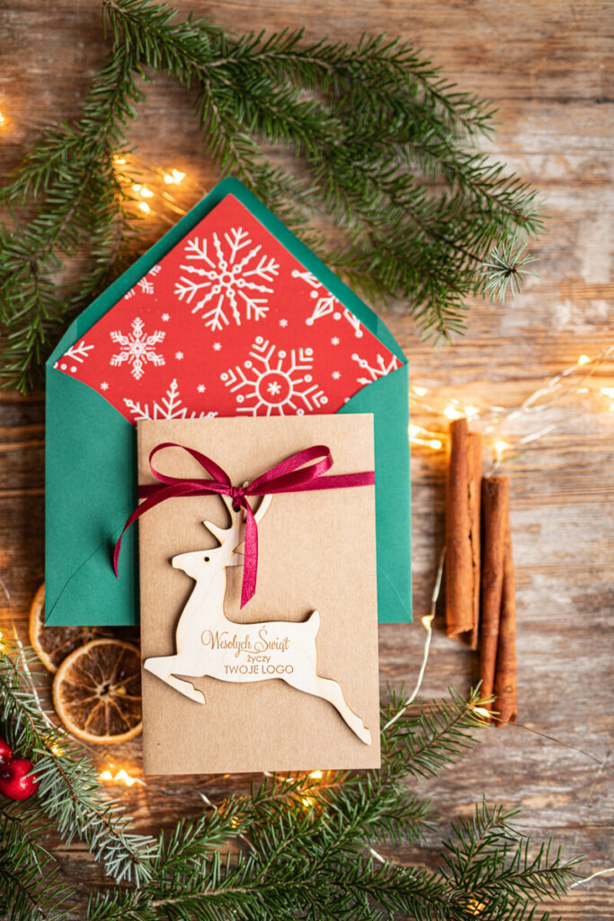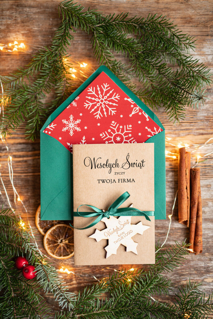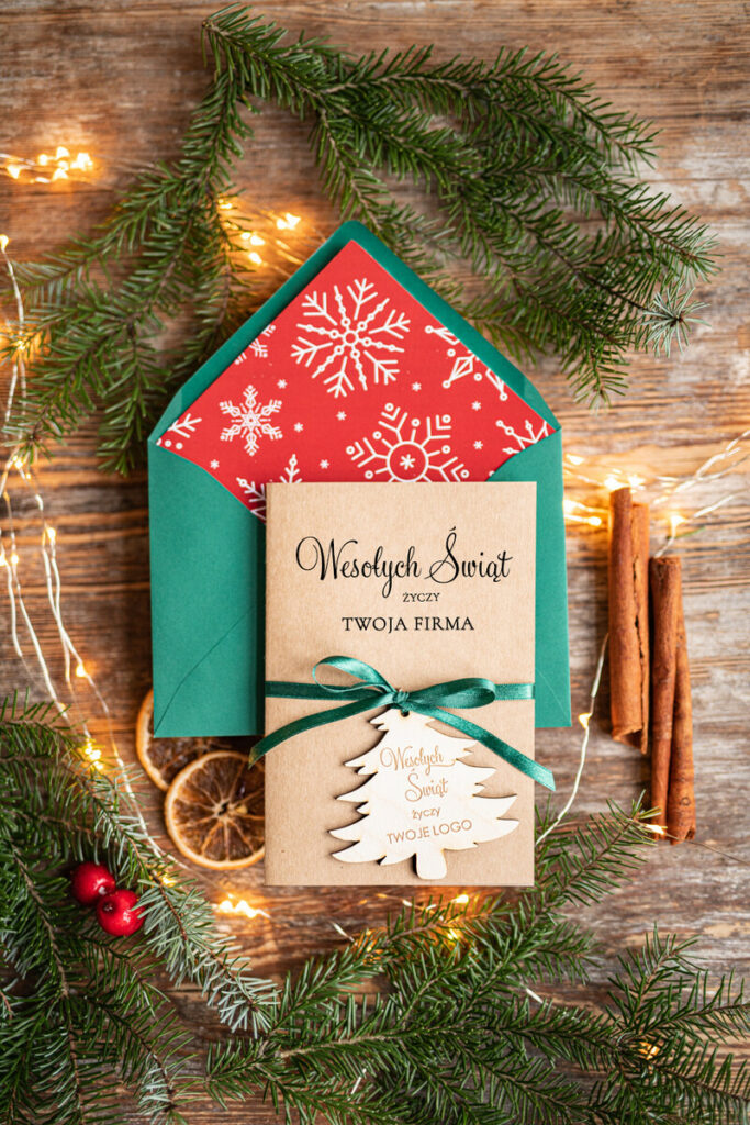 Wyjątkowa kartka świąteczna z logo i drewnianą bombką na choinkę