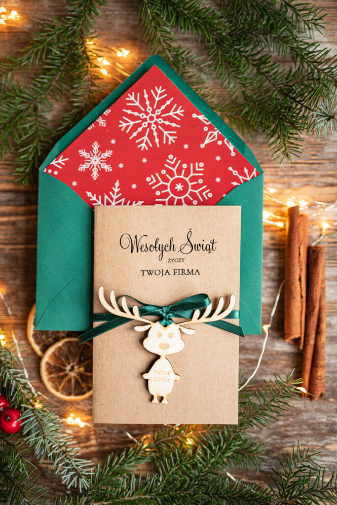 Kartki świąteczne dla firm z drewnianą bombką zawieszką na choinkę z logo firmy – świateczna kartka firmowa z gwiazdką.