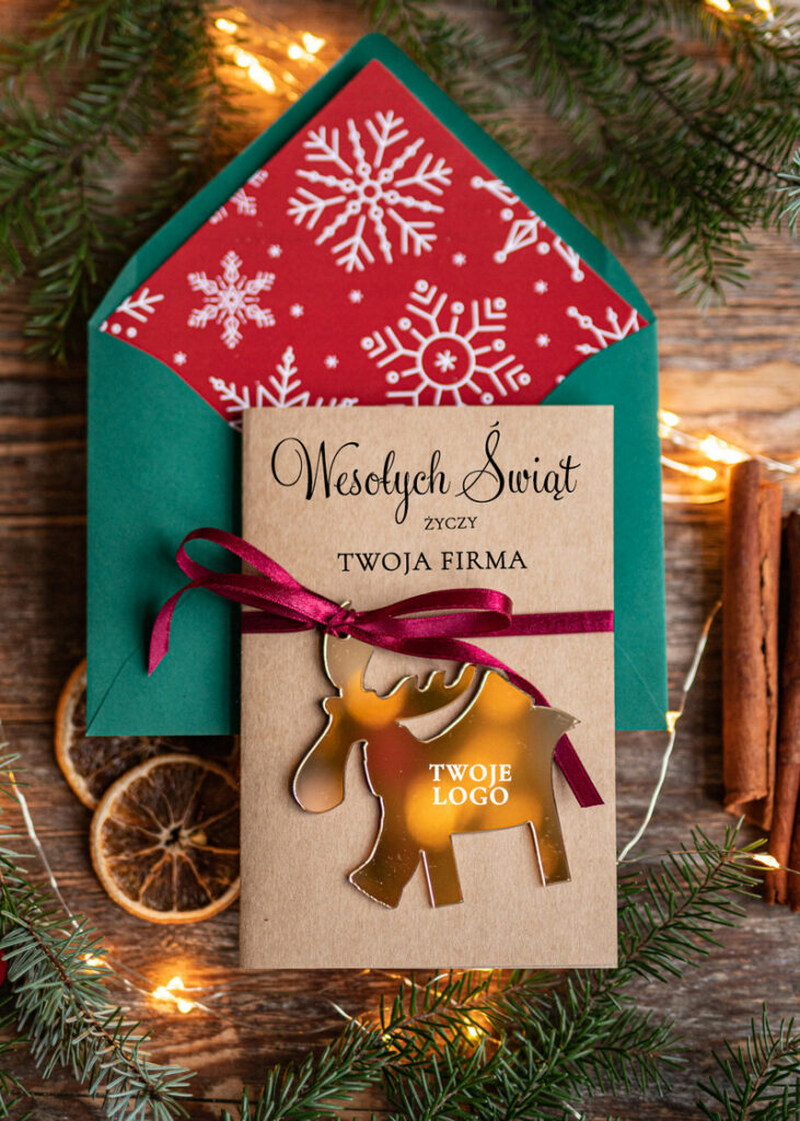 Kartki świąteczne dla firm – złota bombka, zawieszka na choinkę z logo firmy i renifer Święta Bożego Narodzenia to wyjątkowy