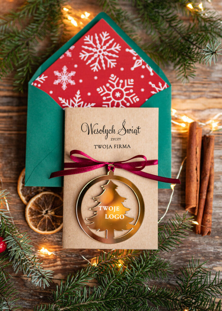 Ekskluzywne kartki świąteczne dla firm z logo: złota bombka, zawieszka na choinkę, renifer