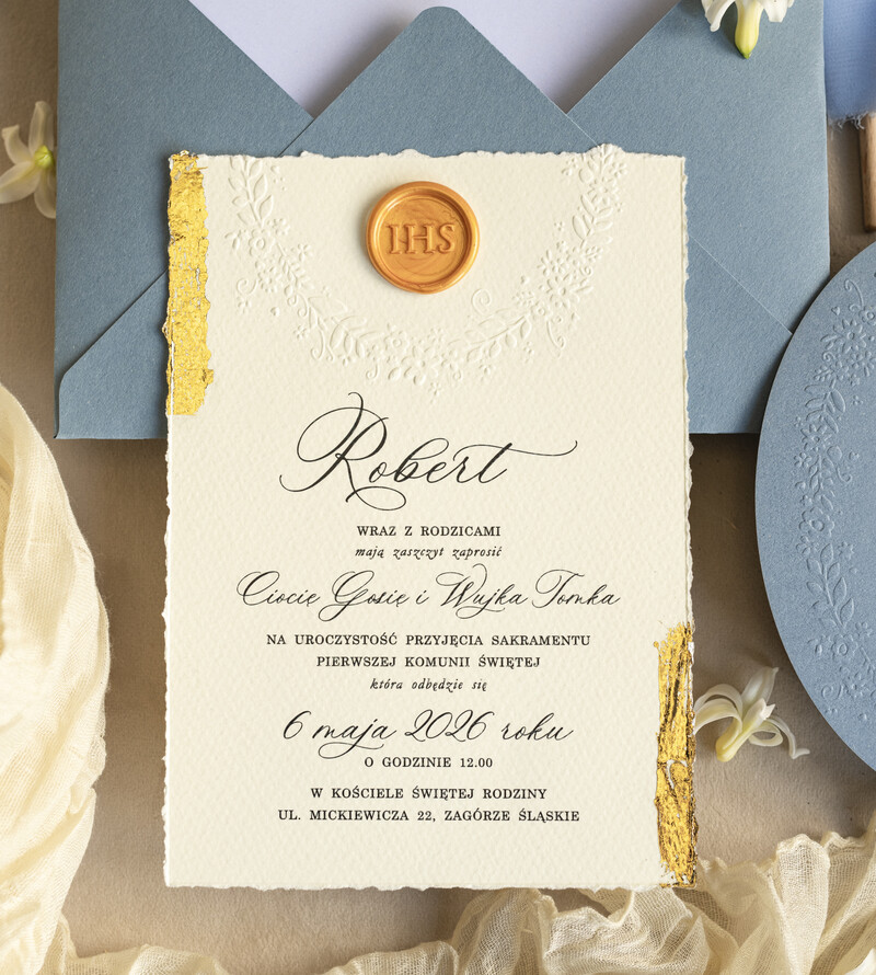 eleganckie zaproszenia komunijne dla chłopca, ręcznie robione,