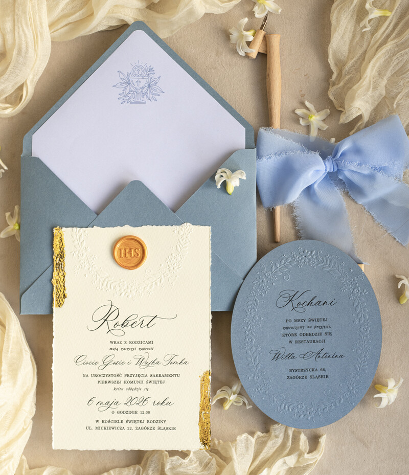 Eleganckie zaproszenia na Komunię dla chłopca często ozdobione są delikatnymi motywami religijnymi, takimi jak krzyże, gołębie czy hostie. Tłoczenia dodają im wyrafinowanego wyglądu, podkreślając rangę uroczystości.