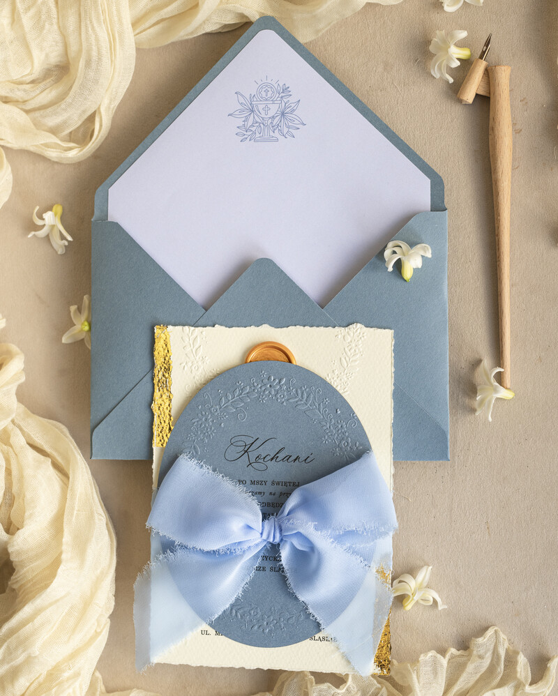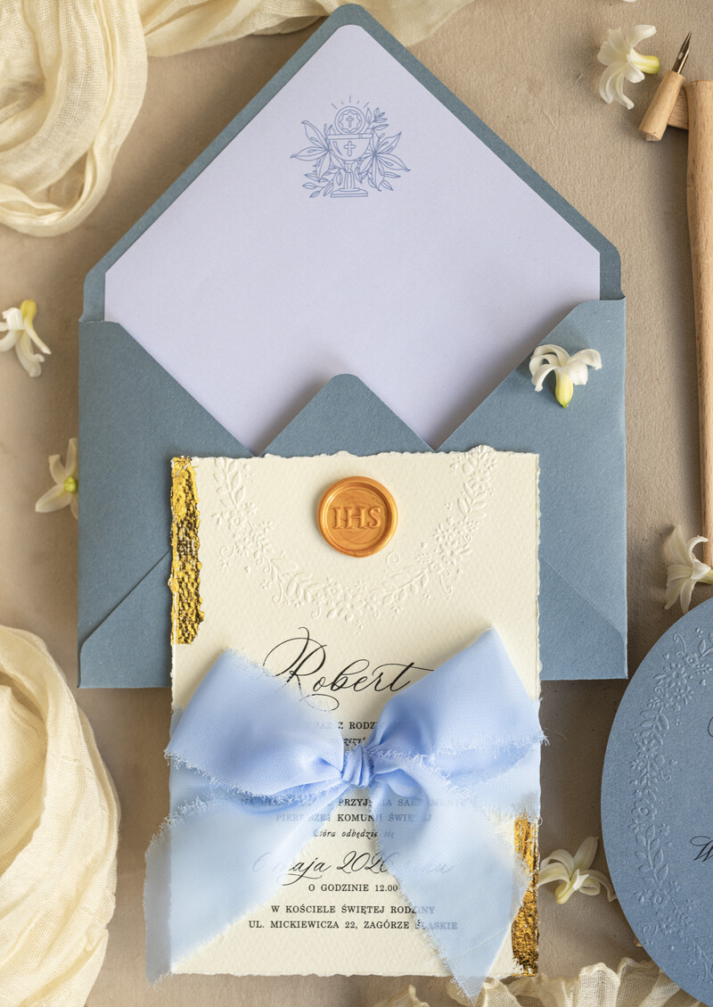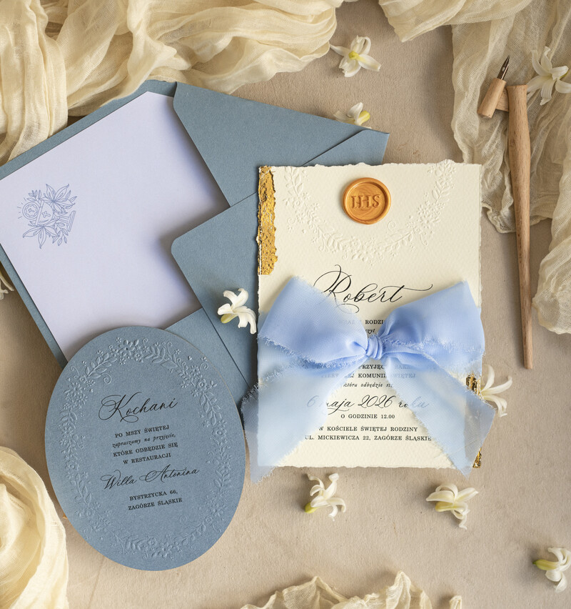 Zaproszenia komunijne dla chłopca marki Decoris zostały stworzone z myślą o eleganckiej, nowoczesnej i spójnej aranżacji całego wydarzenia. Wykonujemy je ręcznie, korzystając wyłącznie z papierów premium oraz starannie dobranych dodatków, dzięki czemu finalny produkt zachwyca precyzją i estetyką.