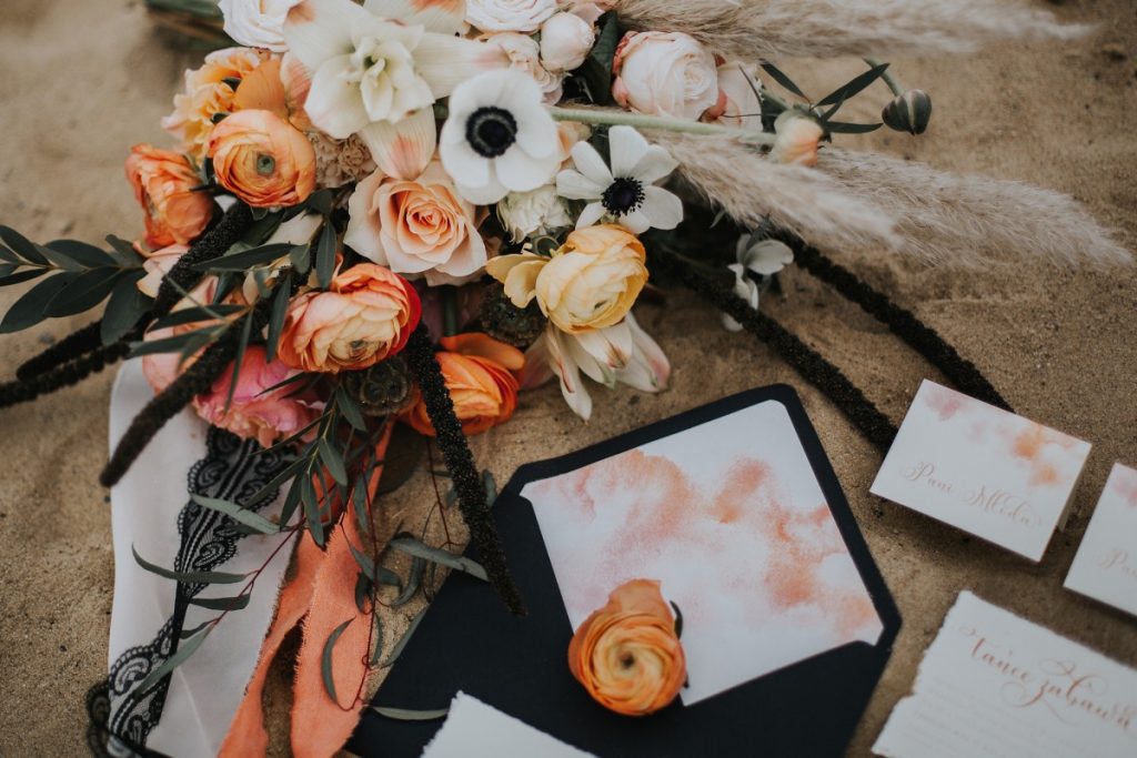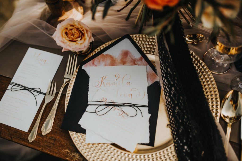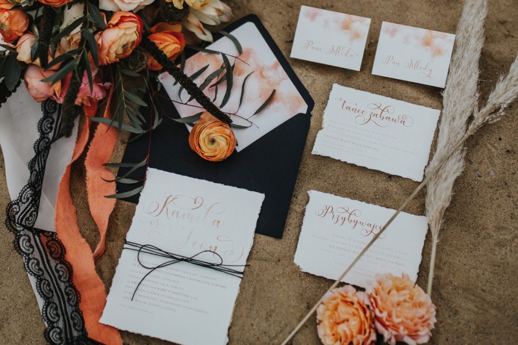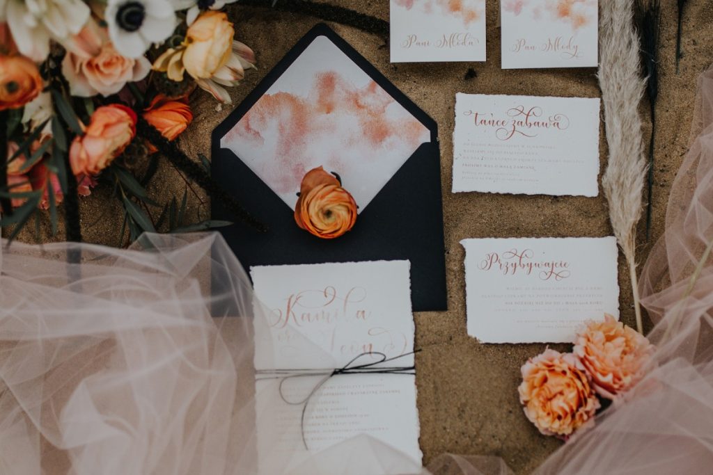 Przygotowana do całej sesji papeteria ślubna, urzeka swoją prostotą. Delikatny papier, jedyna ozdoba to akwarela w ciepłych kolorach i prosty lniany sznurek. Takie zaproszenia ślubne sprawdzą się na ślubie w stylu boho oraz dla Par poszukujących minimalistycznych zaproszeń weselnych.