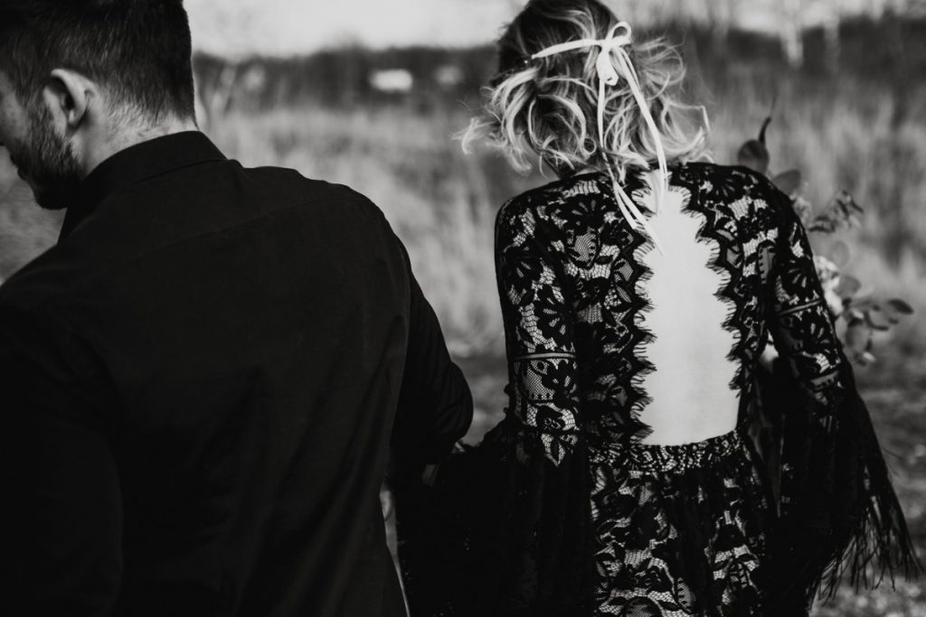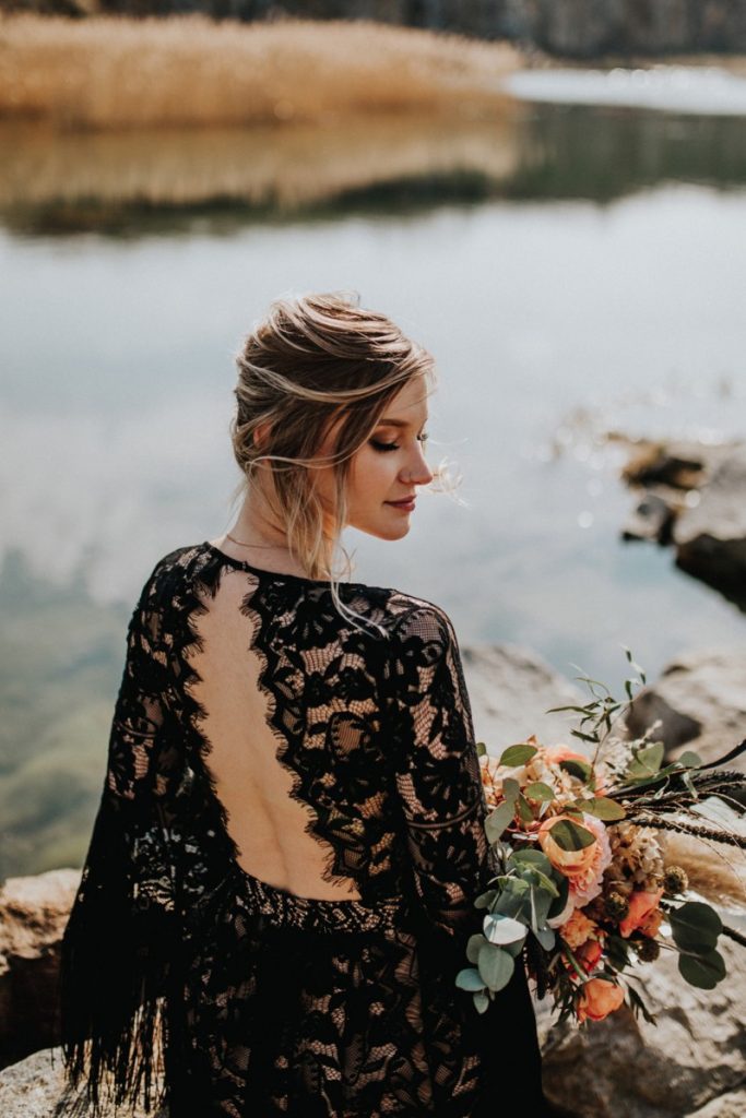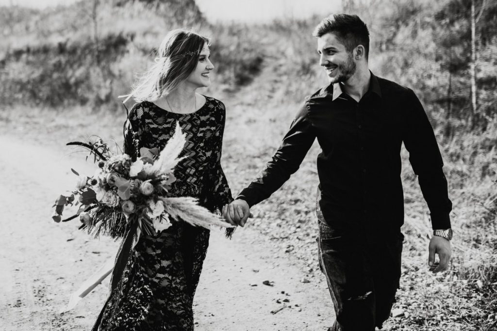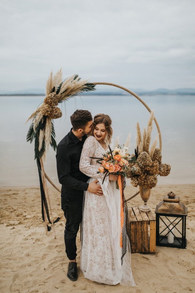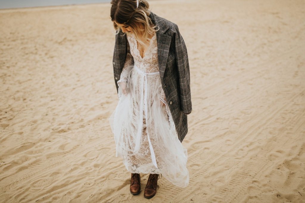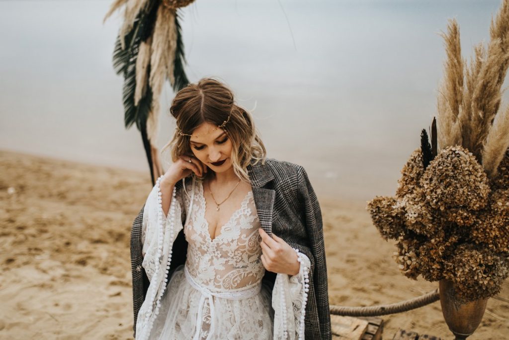 Czarna suknia z koronki autorstwa Marty Trojanowskiej, to pomysł na super odważnych narzeczonych, dla tych które jednak preferują biel mamy drugą stylizację – jednak żadna z nich nie jest standardowa – obie suknie w stylu boho, połączono z nieoczywistymi dodatkami takimi jak botki i oversizowa marynarka.