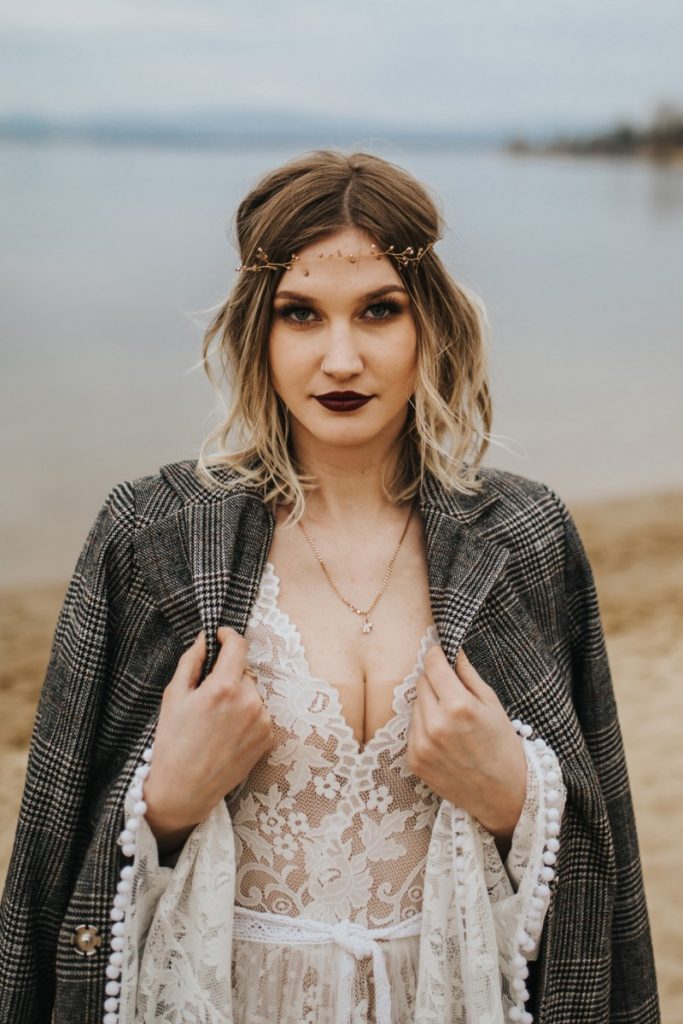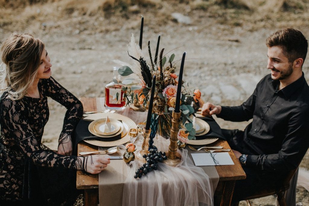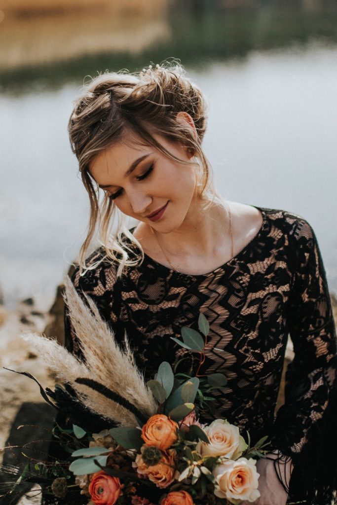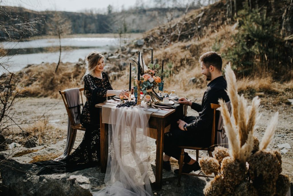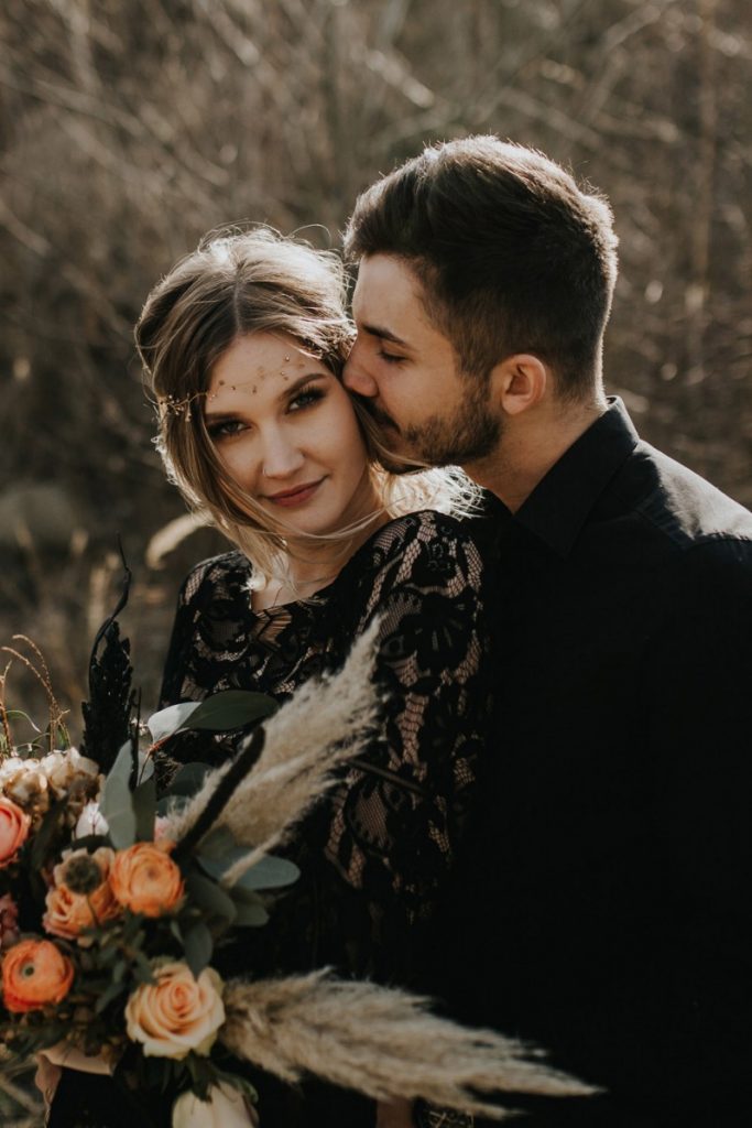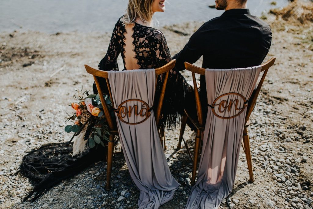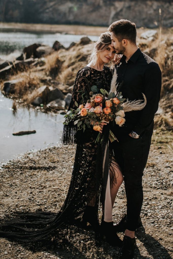Czarna suknia z koronki autorstwa Marty Trojanowskiej, to pomysł na super odważnych narzeczonych, dla tych które jednak preferują biel mamy drugą stylizację – jednak żadna z nich nie jest standardowa – obie suknie w stylu boho, połączono z nieoczywistymi dodatkami takimi jak botki i oversizowa marynarka.