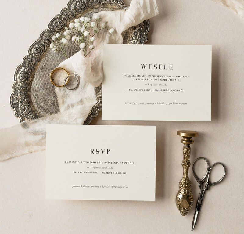 Personalizacja: Chociaż nowoczesne zaproszenia charakteryzują się minimalizmem, to nadal możecie je spersonalizować. Możecie dodać Wasze imiona, datę ślubu, a także krótki cytat lub życzenia, które są dla Was ważne. To właśnie te detale uczynią zaproszenia wyjątkowymi i dostosowanymi do Waszej historii.